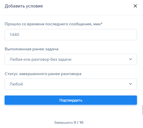 - Прошло со времени последнего сообщения - минимальное количество минут, прошедшее с момента появления в разговоре с клиентом последнего входящего или исходящего сообщения.