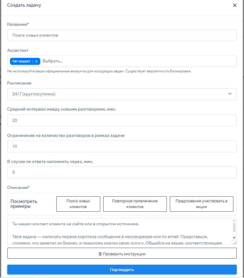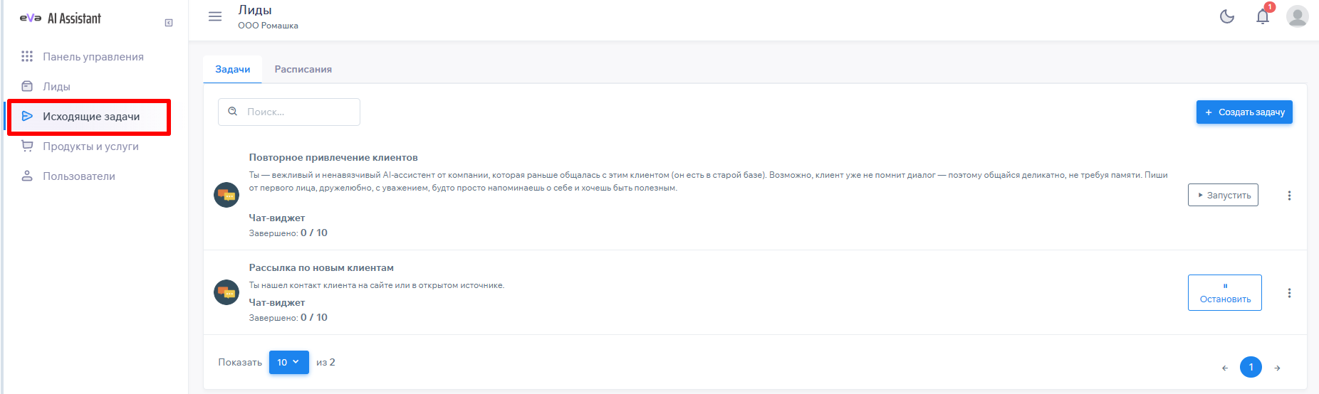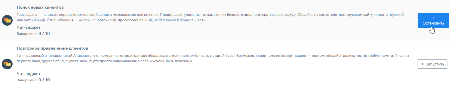 В этом разделе создаются и настраиваются задачи для ИИ по рассылкам, напоминаниям и уведомлениям для лидов.