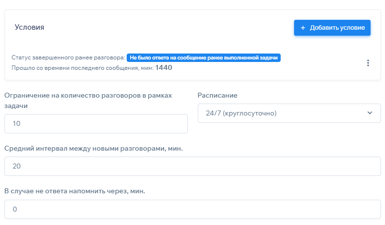 Под блоком с условием можно изменить основные параметры задачи: ограничение на количество разговоров, расписание, средний интервал между новыми разговорами, напоминание в случае неответа.