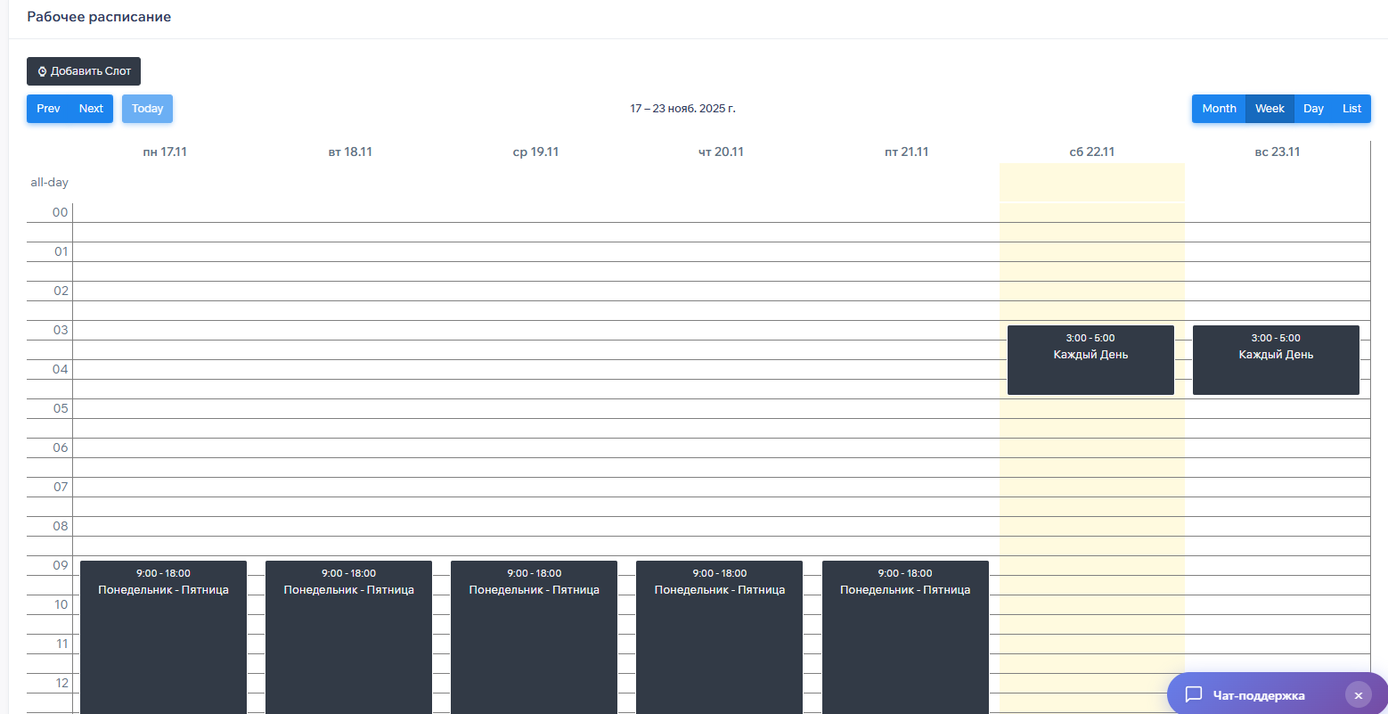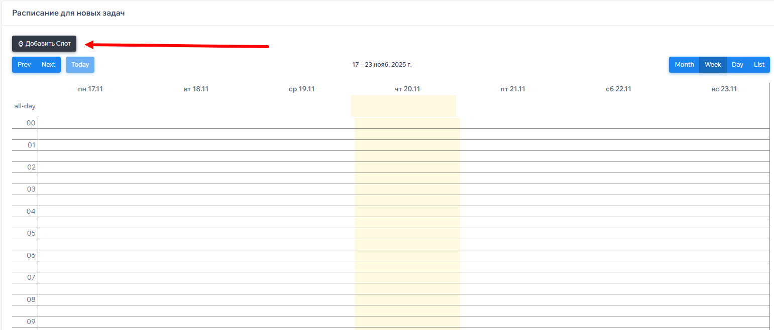 Название расписания появится в списке расписаний. Нажмите на него, чтобы добавить слоты - временные отрезки, доступные для работы задачи.