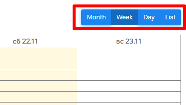 Вверху справа расположены опции, позволяющие задать режим отображения: месяц, неделя, день, либо отображение списком.